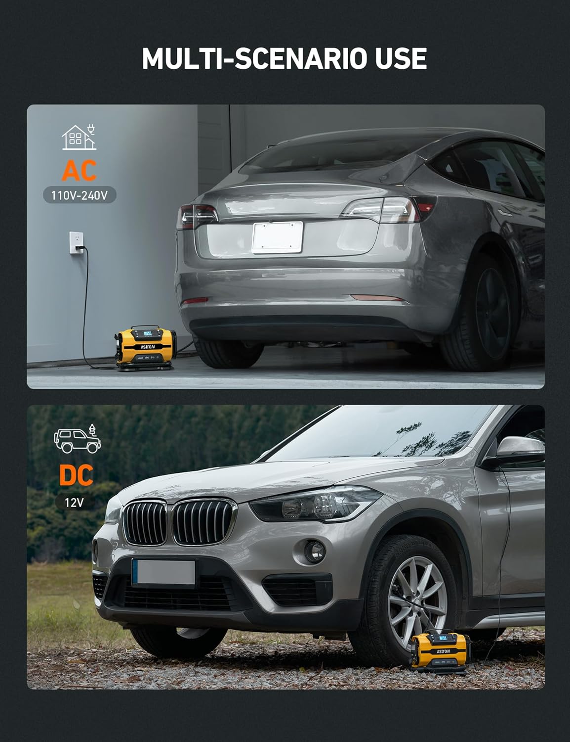 - 12 V DC/120 V AC Dual Power: The AstroAI Tire Inflator features dual power supplies, compatible with 12 V car cigarette lighters and 120 V household outlets, convenient for both home and travel use. The AstroAI Tire Inflator can easily switch between high-pressure and high-current inflation modes. High-pressure mode inflates car, bicycle and motorcycle tires along with sports equipment and other small inflatables. Large-volume mode inflates bigger low-pressure objects like air mattresses